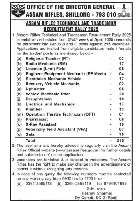 Assam Rifles Recruitment 2025 : नमस्‍कार दोस्‍तों, यदि आपमें देश की सेवा करने का जज़्बा हैं, तो भारत देश की सेवा करने करने और प्रभावशाली सरकार नौकरी पाना चाहते हैं तो हम आपको ऐसी ही एक नौकरी के बारे में बताने जा रहे हैं। जी हां, असम राइफल्स भर्ती 2025 आपके लिए एक शानदार मौका लेकर आई है। इस साल तकनीकी और ट्रेड्समैन पदों पर 215 रिक्तियों को भरने के लिए आवेदन मांगे जाएंगे। भर्ती की आधिकारिक अधिसूचना जल्द ही जारी की जाएगी, जिसमें आवेदन प्रक्रिया, योग्यता, चयन प्रक्रिया और अन्य महत्वपूर्ण जानकारियां दी जाएंगी। अगर आप इस मौके को भुनाना चाहते हैं, तो पहले से ही अपनी तैयारी शुरू कर दें। यह अवसर उन युवाओं के लिए खास है जो 10वीं, 12वीं पास हैं या आईटीआई, डिप्लोमा, या ग्रेजुएशन की योग्यता रखते हैं।