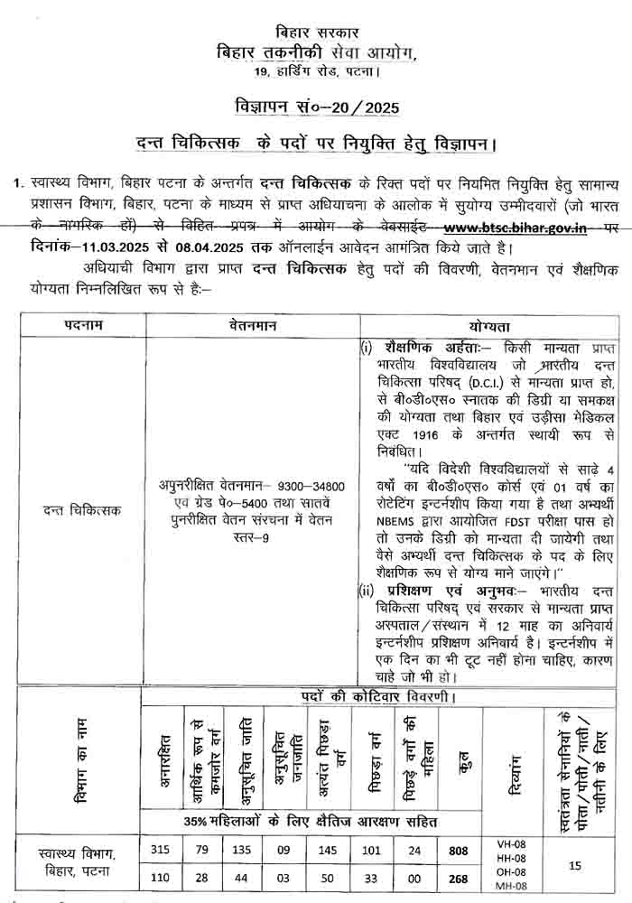 BTSC Dentist Recruitment 2025 808 पदों पर भर्ती, पात्रता, आवेदन प्रक्रिया और अंतिम तिथि की पूरी जानकारी पाएं। बिहार BTSC डेंटिस्ट भर्ती 2025 के लिए आवेदन करें!