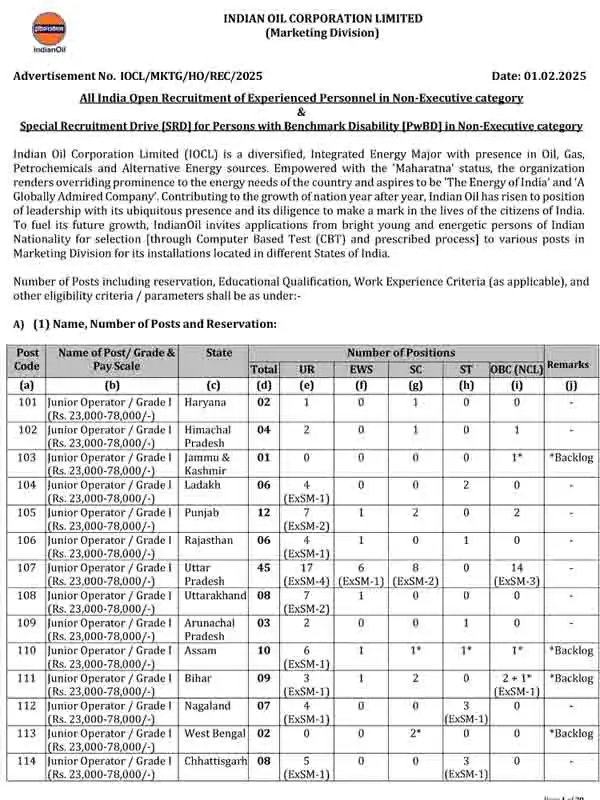 IOCL Junior Operator Vacancy 2025 के अन्तर्गत तीन विभागों में रिक्तियां निकाली गई हैं। जिसमें, जूनियर ऑपरेटर ग्रेट-I, जूनियर अटेंडेंट ग्रेड-I और जूनियर बिजनेस असिस्टेंट ग्रेड-III के पद खाली हैं। इन पदों पर कुल भर्ती इस प्रकार है :