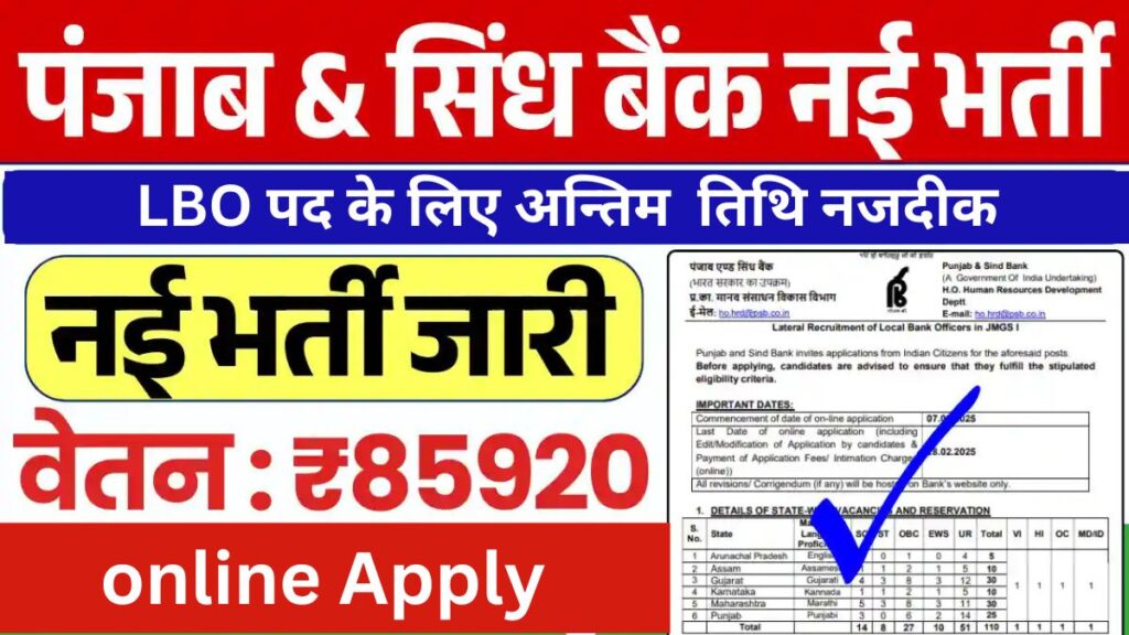 Punjab and Sind Bank LBO Vacancy 2025 :पंजाब एंड सिंध बैंक में स्थानीय बैंक अधिकारी (LBO) के 110 पदों पर भर्ती! जानें पात्रता, आवेदन प्रक्रिया और सैलरी। अप्लाई करें जल्दी!