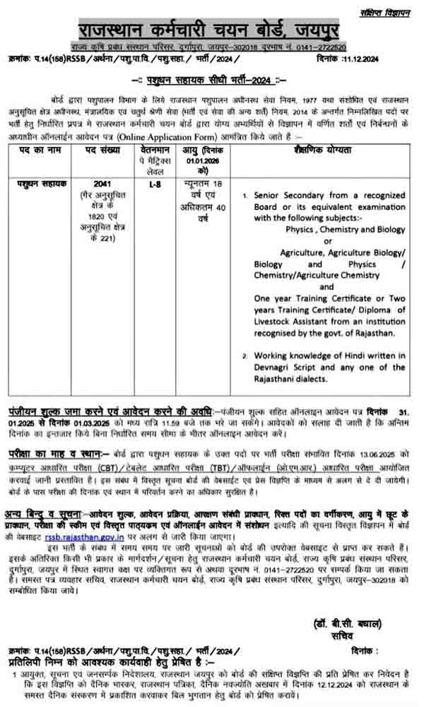 RSMSSB ने पशुधन सहायक भर्ती 2025 के लिए आधिकारिक अधिसूचना (Notification) जारी कर दी है। इसके अन्तर्गत 2041 भर्ती निकाली गई हैं। पशुधन सहायक भर्ती, जीव विज्ञान, कृषि और संबंधित क्षेत्रों के विभागों में की जाती है। अधिसूचना में दी गई पात्रता के अनुसार योग्य उम्मीदवार इस भर्ती के लिए आवेदन कर सकता है।